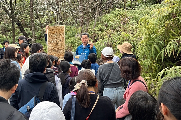 当日は、講師のジブリパークの深谷さんの案内のもと「もののけの里」周辺の普段は関係者しか入ることのできない限られたエリアに分け入り、この地形と土壌ならでの、希少植物であるフモトミズナラの観察やどんぐり探しやクイズを親子で楽しんでいただきました。