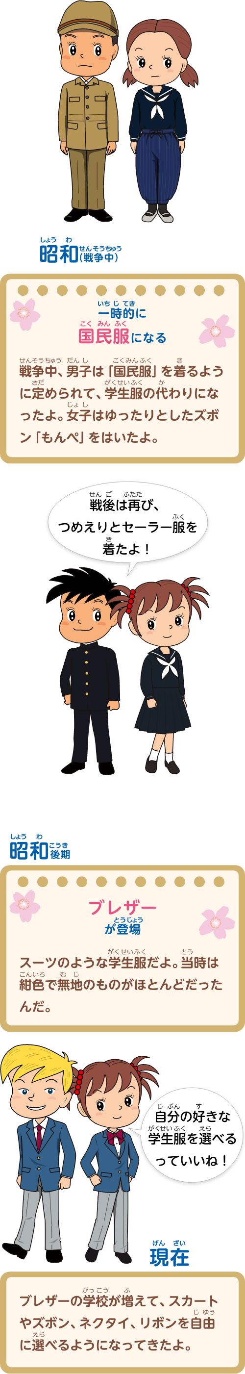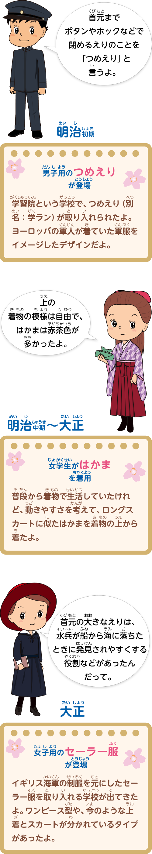 明治初期:男子用のつめえりが登場。明治中期〜大正:女学生がはかまを着用。大正:女子用のセーラー服が登場。 昭和(戦争中):一時的に国民服になる。昭和後期:ブレザーが登場。現在:ブレザーの学校が増えて、スカートやズボン、ネクタイ、リボンを自由に選べるようになってきたよ。