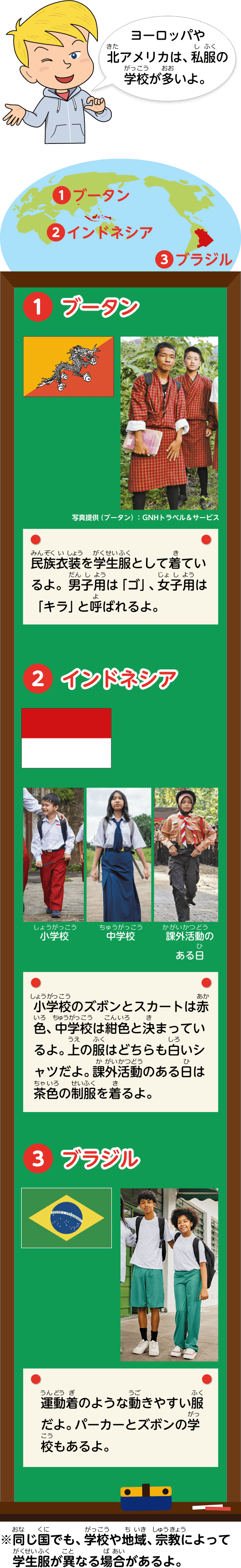 ブータン:民族衣装を学生服として着ているよ。男子用は「ゴ」、女子用は「キラ」と呼ばれるよ。インドネシア:小学校のズボンとスカートは赤色、中学校は紺色と決まっているよ。上の服はどちらも白いシャツだよ。課外活動のある日は茶色の制服を着るよ。ブラジル:運動着のような動きやすい服だよ。パーカーとズボンの学校もあるよ。