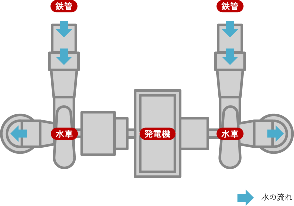 水力発電は、水が高い位置から低い位置に落ちるときの位置エネルギーを利用して水車を回し、発電をするしくみである。貯水池に設けた取水口から導水路・鉄管を通して水車に水を送り、水車と連結した発電機が電力を作り出す。