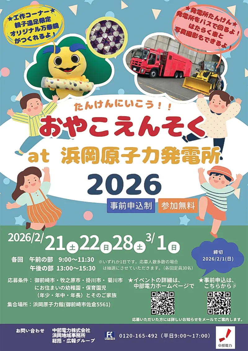 浜岡原子力発電所で、ユウユウのオリジナル工作と発電所をバスで探検できる体験イベントを開催します。